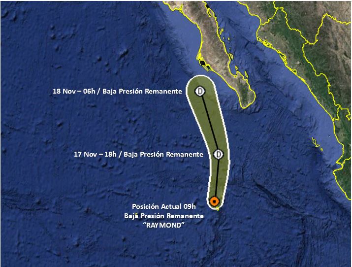 CIUDAD DE MÉXICO.- “Raymond” se ha debilitado a una “Baja Presión Remanente” al sur-suroeste de Baja California Sur.