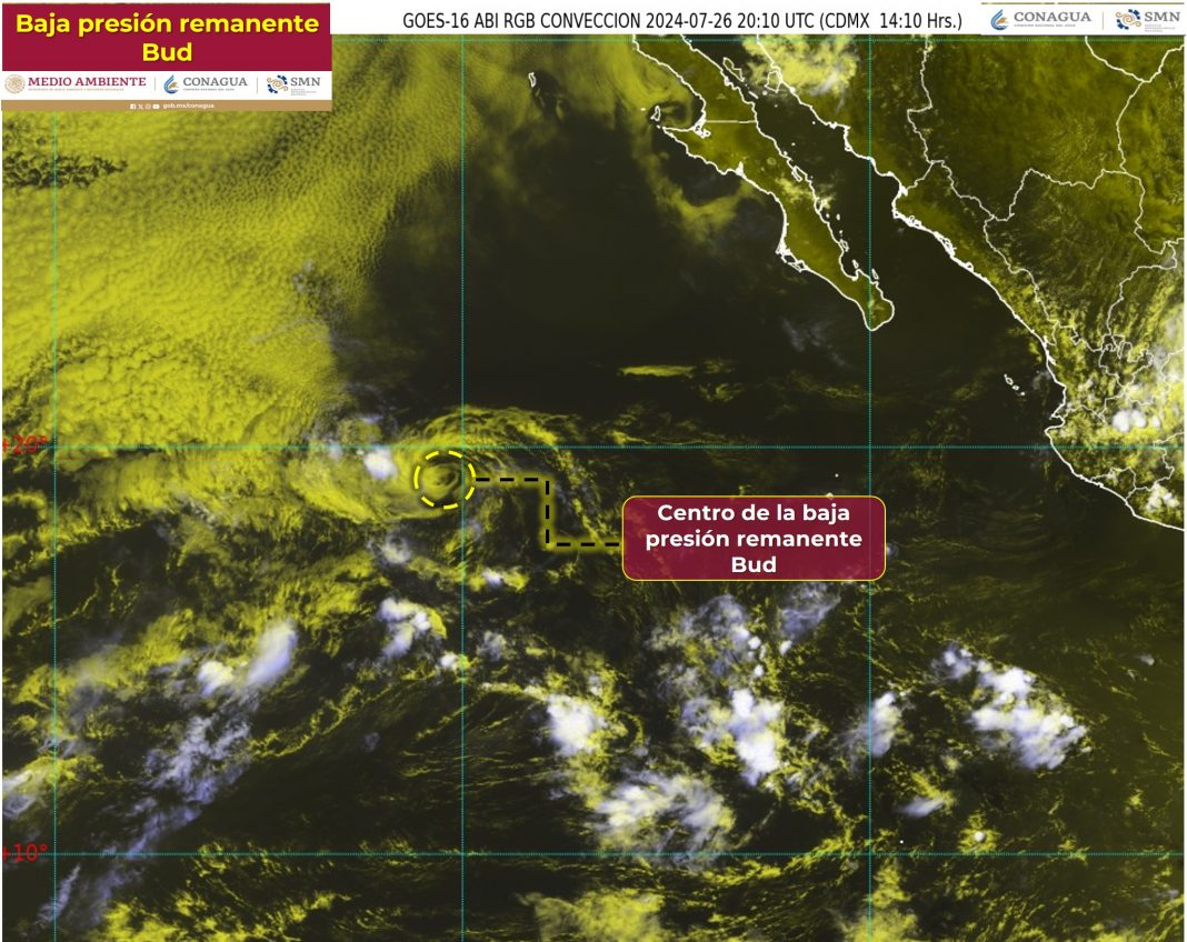CIUDAD DE MÉXICO.- Bud se ha degradado a baja presión remanente al suroeste de Baja California Sur, aunque se desarrolla un nuevo potencial ciclón con un 20 por ciento de formación a 7 días.