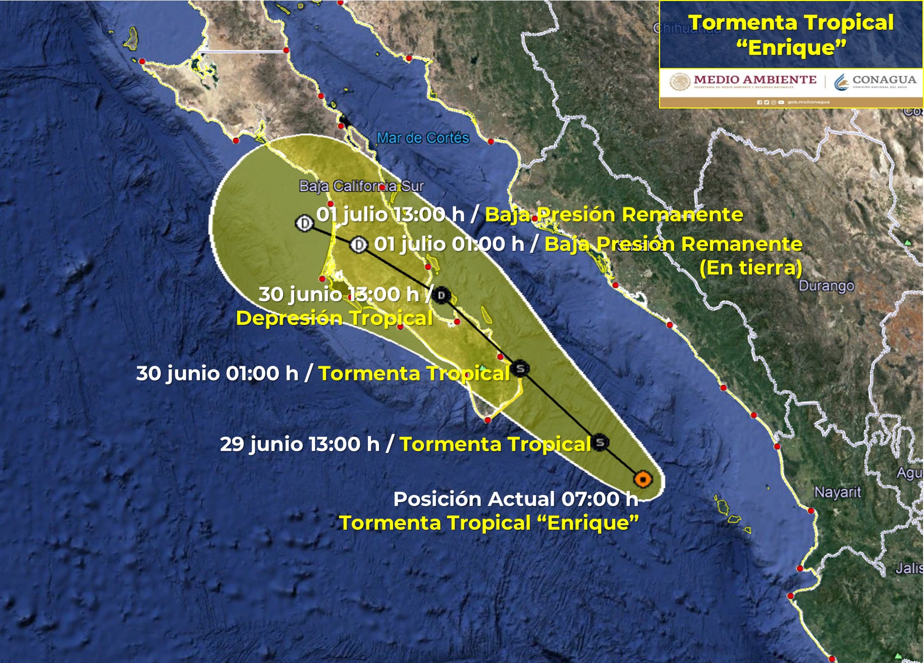 CIUDAD DE MÉXICO.- La tormenta tropical “Enrique” continía debilitándose mientras se desplaza hacia Baja California Sur, sus bandas nubosas ocasionan lluvias fuertes a puntuales intensas sobre estados del occidente y noroeste del territorio nacional.