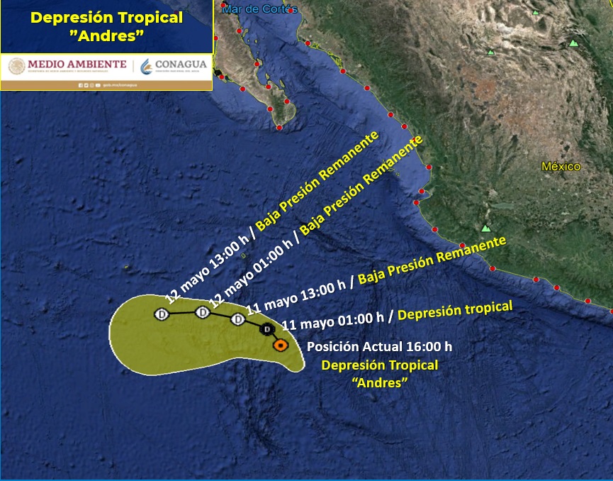 CIUDAD DE MEXICO.- Andrés ahora como depresión tropical al suroeste de Jalisco. El aporte de humedad generado por su circulación, ocasionará lluvias puntuales fuertes en Jalisco y Michoacán, además de chubascos en Colima y lluvias aisladas en Nayarit, Sinaloa y Baja California Sur.