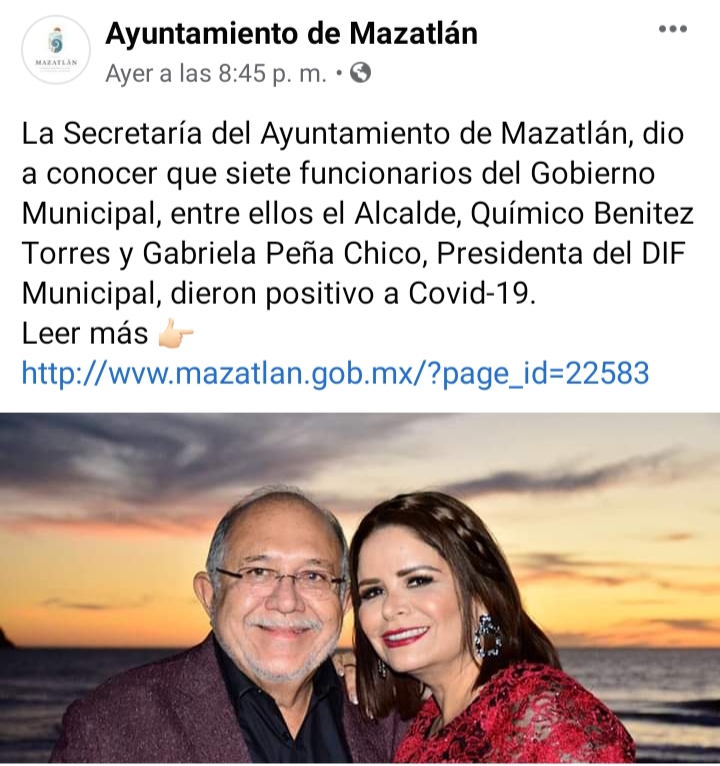 “La Secretaría de Salud del estado dio a conocer que siete funcionarios del gobierno municipal, entre ellos el alcalde, Benitez Torres y Gabriela Peña Chico, presidenta del DIF municipal, dieron positivo a COVID-19”, señaló ayer un comunicado emitido por el ayuntamiento de Mazatlán.