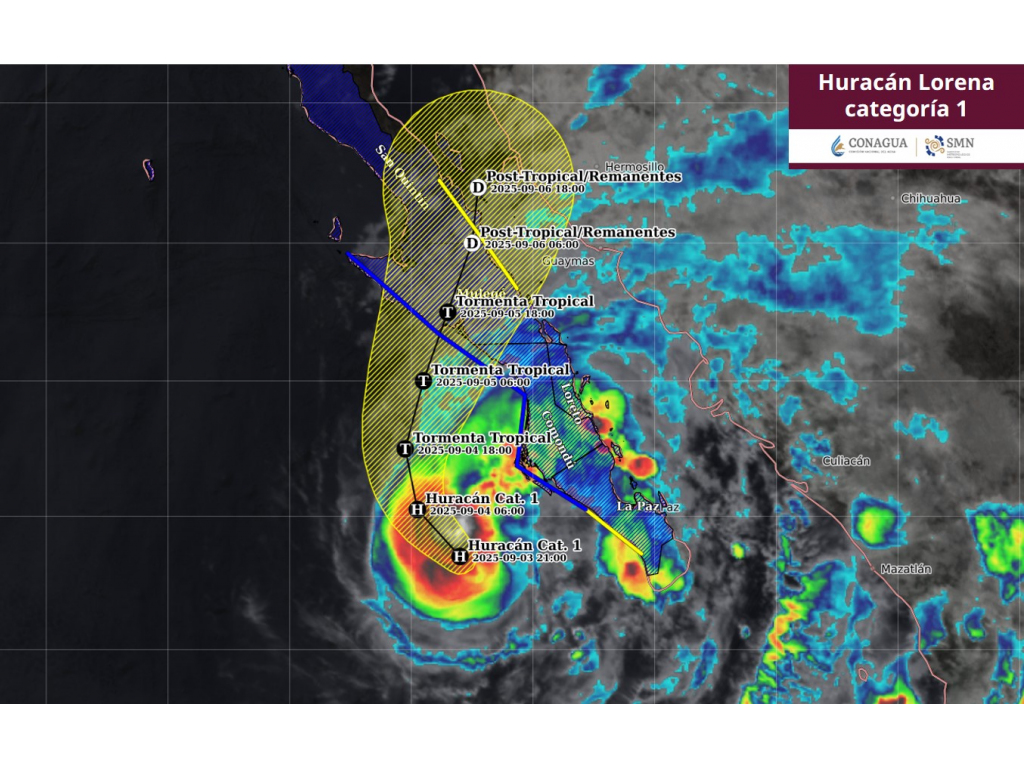 CIUDAD DE MÉXICO.- Lorena se mantiene como huracán de categoría 1 en la escala de Saffir-Simpson al suroeste de Baja California Sur.