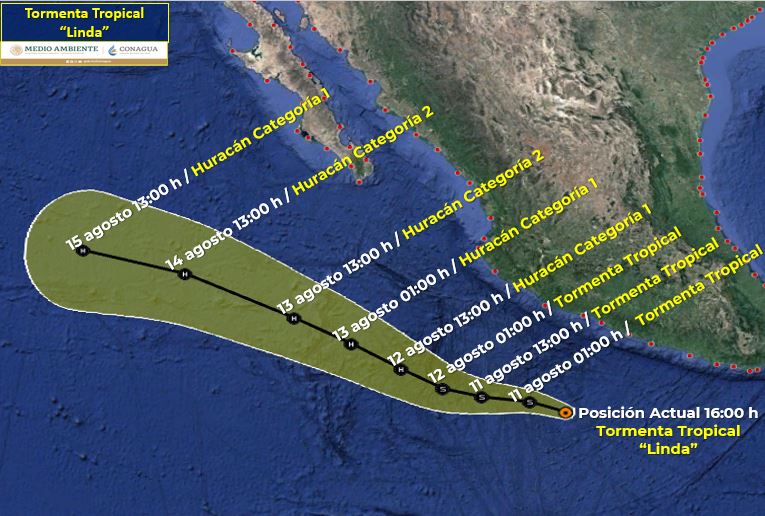 Se ubica a 755 kilómetros al oeste-suroeste de Cabo San Lucas, Baja California Sur con vientos sostenidos de 75 kilómetros por hora y rachas de 95 kilómetros por hora.