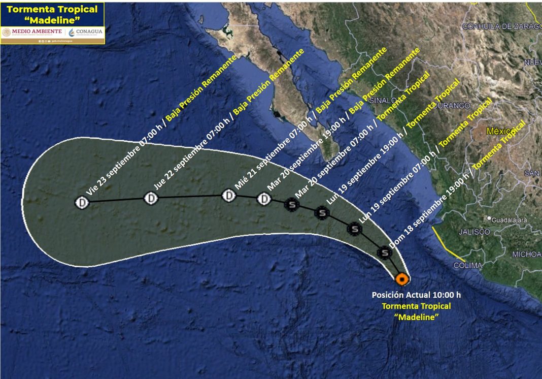 CIUDAD DE MÉXICO.- La tormenta tropical Madeline se desplaza cerca de las costas de Jalisco, generará lluvias de muy fuertes a intensas en el occidente de México, además de fuertes rachas de viento y oleaje elevado en costas de dicha región.