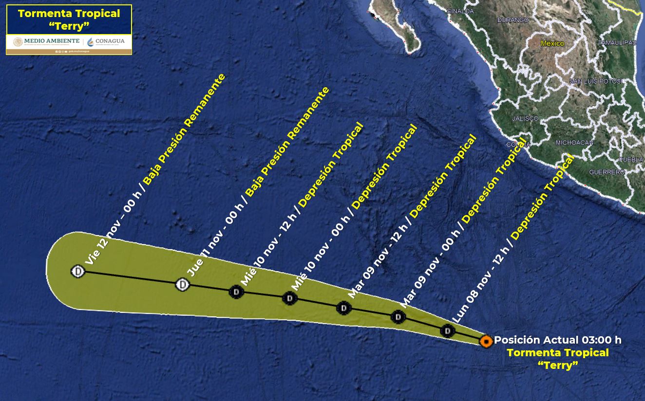 El centro de la Tormenta Tropical “Terry” se localiza al sur de las costas de Michoacán y Colima, se desplaza hacia el oeste-noroeste, sin afectar al territorio mexicano.