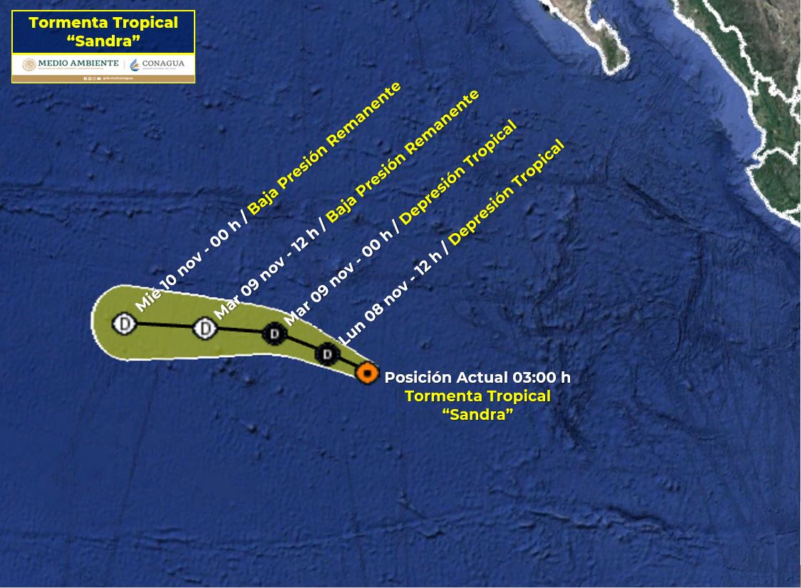 CIUDAD DE MÉXICO.- El centro de la Tormenta Tropical “Sandra” se localiza al suroeste de Cabo San Lucas, B.C.S. No representa peligro para territorio mexicano.