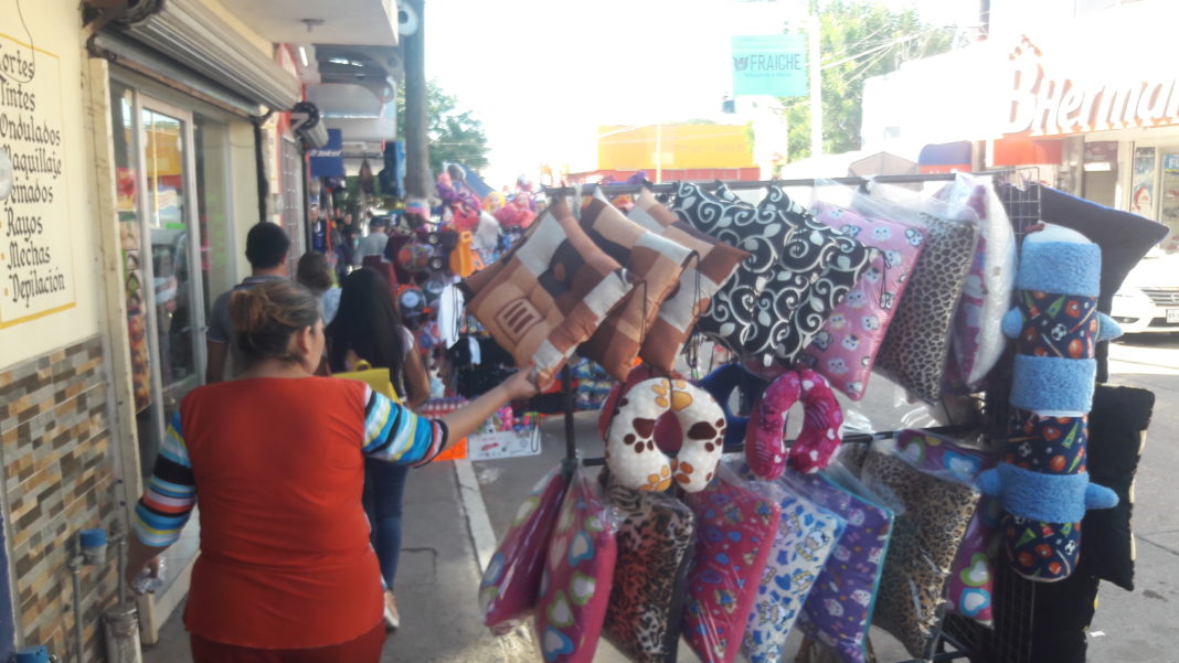 Juguetes, ropa, artículos de belleza, empaques para regalo, entre otros, son los artículos que se pueden observar en banquetas donde se obstruye el paso peatonal