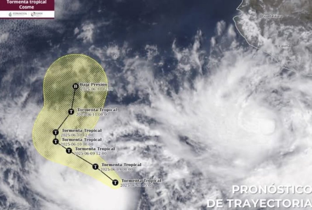 CULIACÁN, Sin.- El centro de la tormenta tropical Cosme se ubica a mil 75 al sur de Cabo San Lucas, BCS., presenta vientos máximos de 75 km/h con rachas de 95 km/h, y se mueve al noroeste a 13 km/h.