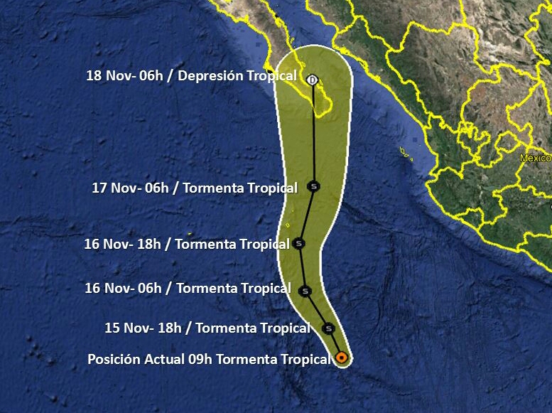 A las 07:19 horas se ubicó a 720 km al sur-suroeste de Playa Perula, Jal., y a 985 km al sur de Cabo San Lucas, B.C.S