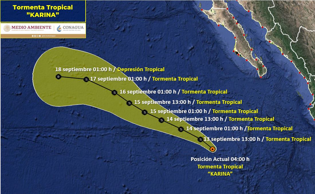 CIUDAD DE MÉXICO.- La depresión tropical “17-E” se intensificó a la tormenta tropical “Karina” al suroeste de la península de Baja California. No representa peligro para territorio mexicano.