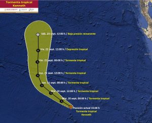 CIUDAD DE MEXICO.- La depresión tropical Trece-E se ha intensificado a la tormenta tropical Kenneth, su centro se localiza al suroeste de las costas de Baja California.