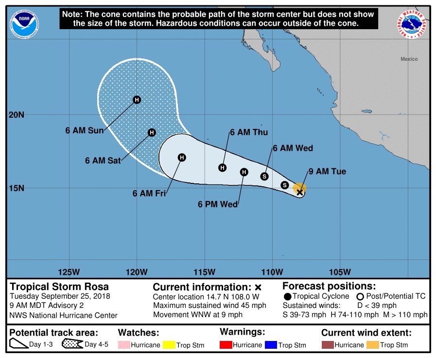 Rosa originará tormentas de fuertes a puntuales muy fuertes en los estados de Nayarit, Jalisco, Colima y Michoacán.