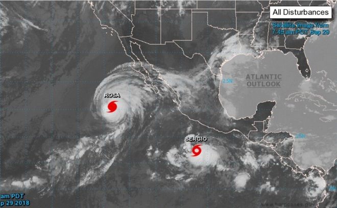 Mientras tanto “Rosa” continúa como huracán categoría 2 en la escala Saffir-Simpson, y se localiza al sur-suroeste de la Península de Baja California, reportó el Servicio Meteorológico Nacional (SMN).
