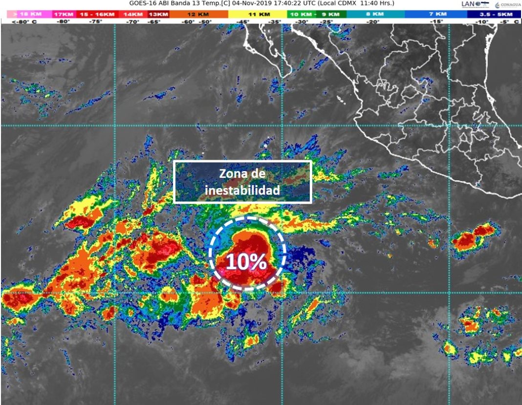CIUDAD DE MÉXICO.- Se ha formado una zona de inestabilidad con 10% de probabilidad para desarrollo ciclónico en 48 horas y en cinco días. Se localiza al suroeste de Jalisco.
