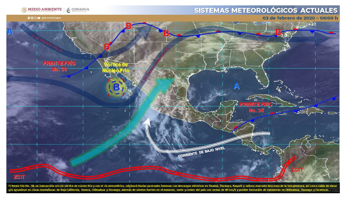 CIUDAD DE MÉXICO.- Este día, el frente frío No. 38 se desplazará sobre el noroeste del territorio nacional, e interaccionará con un vórtice de núcleo frío y con el río atmosférico, generando lluvias puntuales intensas con descargas eléctricas en Sinaloa, Durango, Nayarit y Jalisco.