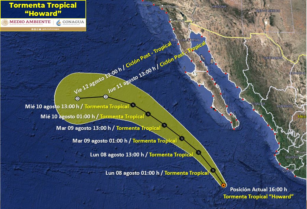 CIUDAD DE MÉXICO.- Se formó la tormenta tropical Howard a partir de la depresión tropical “9-E” al sur de Baja California Sur. Su circulación refuerza las condiciones para lluvias, vientos fuertes y oleaje elevado en costas del occidente del país y el sur de Baja California Sur.