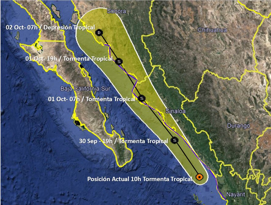 Estiman lluvias intensas a puntuales torrenciales (150 a 250 litros por metro cuadrado) en Sinaloa; lluvias muy fuertes a puntuales intensas (75 a 150 litros por metro cuadrado) en Baja California Sur, Chihuahua, Durango, Nayarit, Jalisco, Colima y Michoacán; lluvias fuertes a puntuales muy fuertes (50 a 75 litros por metro cuadrado) en Sonora; intervalos de chubascos con lluvias puntuales fuertes (25 a 50 litros por metro cuadrado) en Zacatecas; e intervalos de chubascos (5.1 a 25 litros por metro cuadrado) en Aguascalientes y Guanajuato.