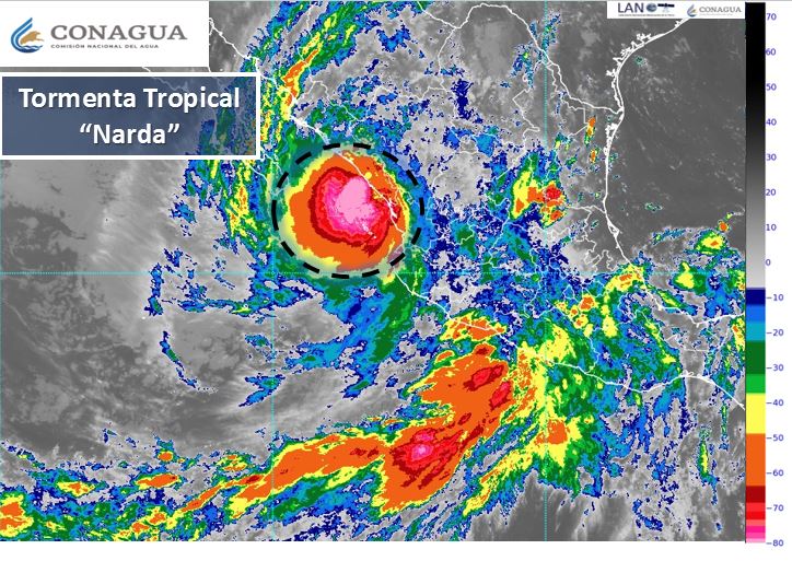 CIUDAD DE MÉXICO.- La depresión tropical “Narda“ se fortaleció nuevamente como tormenta tropical. A las 09:15 horas del Pacífico norte se localizó a 80 kilómetros al sur de Mazatlán y con estimados de lluvia hasta mañana martes y apuntando a tocar tierra el ojo del fenómeno en el centro-norte del estado.