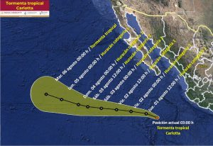 CIUDAD DE MÉXICO.- La tormenta tropical Carlotta continúa intensificándose, sus bandas nubosas ocasionan lluvias puntuales fuertes en Nayarit, Jalisco, Colima y Michoacán, además de oleaje elevado en las costas de dichos estados.