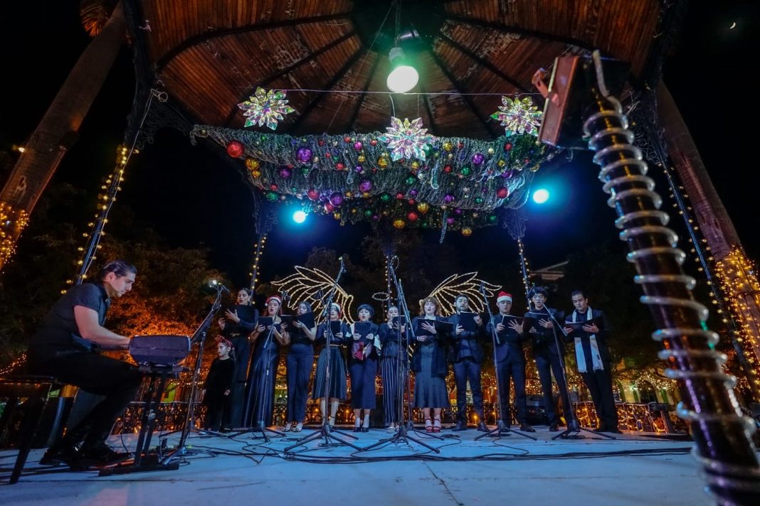 MACHADO, Sin.- La Plazuela Machado se transformó en un escenario mágico con la iluminación y decoración navideña que personal del Instituto Municipal de Cultura, Turismo y Arte de Mazatlán colocó para dar la bienvenida a la Navidad inaugurada por la Presidenta Municipal de Mazatlán, Estrella Palacios Domínguez.