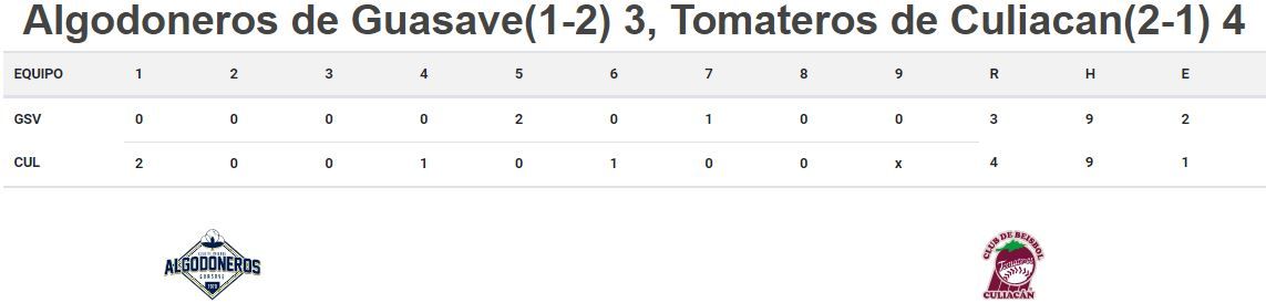 Tomateros tomó ventaja en la primera baja, con HR de dos carreras de Joey Meneses, contra el abridor David Holmberg. Fue el 17 de por vida en postemporada para “Cabajoey”, además que llegó a 55 CI en esta etapa instancia.