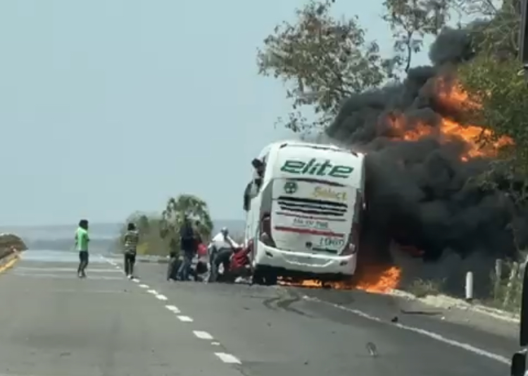 Se aprecia el camión Elite incendiándose y las personas saltando por una de las ventanas; es en la carretera Benito Juárez ‘La Costera’ en las inmediaciones del municipio de Angostura
