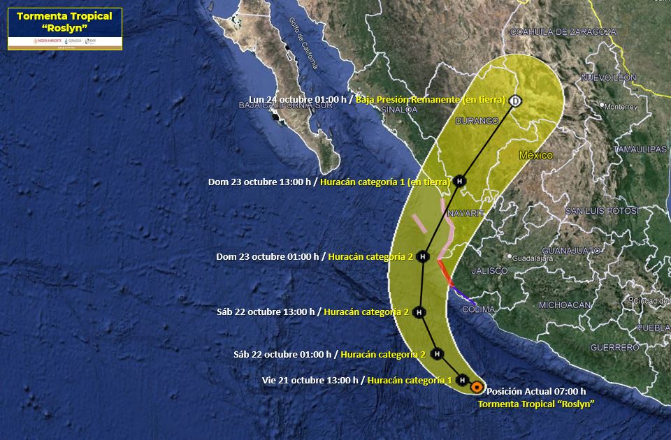 CIUDAD DE MÉXICO.- La tormenta tropical Roslyn tocaría tierra el próximo lunes en el norte de Nayarit, límites con el municipio sinaloense de Escuinapa.