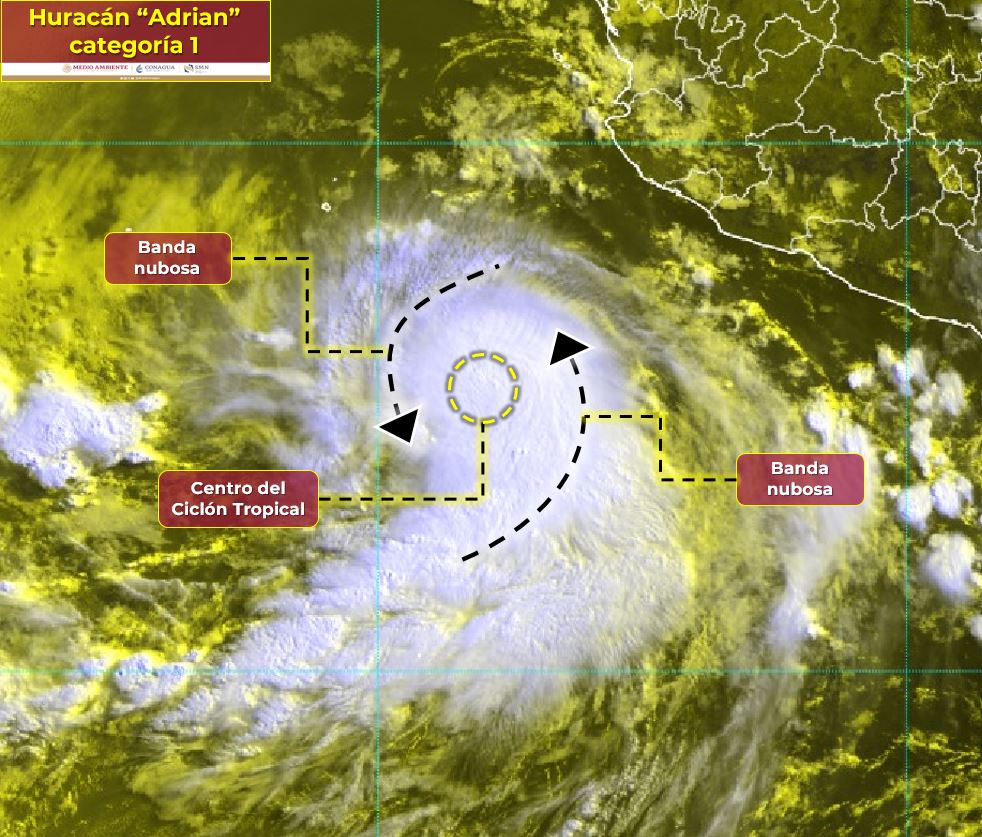 CIUDAD DE MÉXICO.- Adrian” ahora como Huracán de categoría 1 en la escala de Saffir-Simpson.