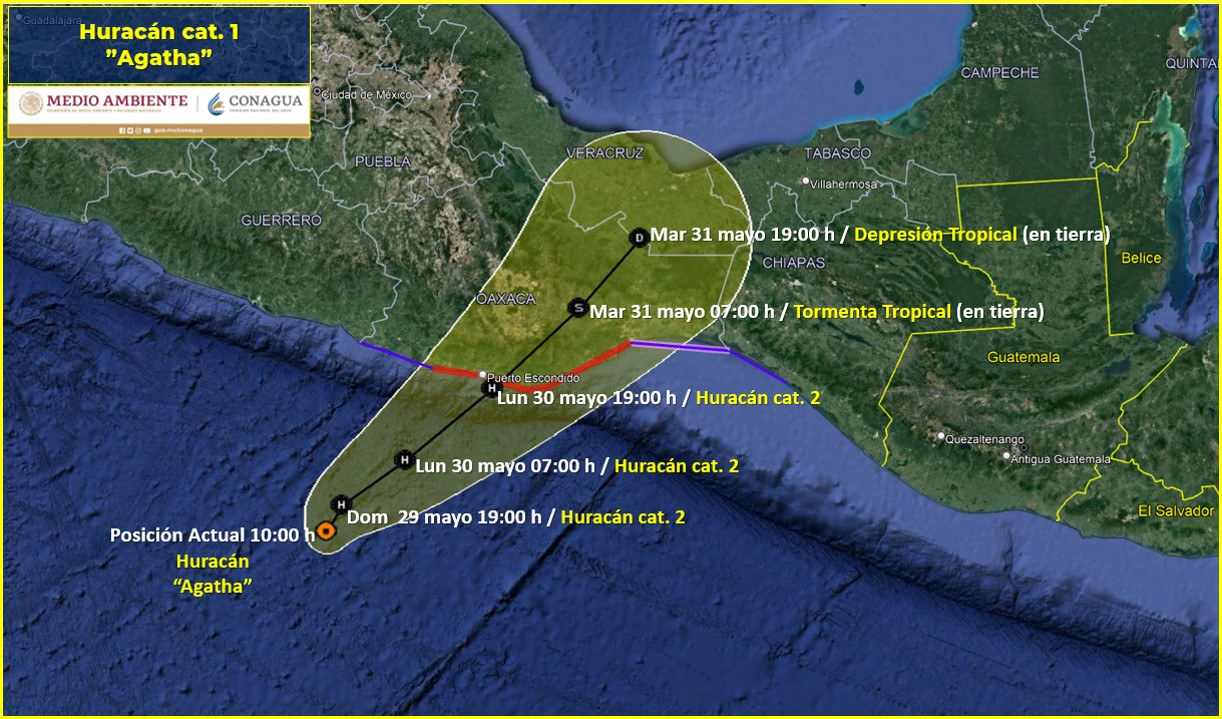 Las bandas nubosas de la tormenta tropical Agatha ocasionarán lluvias puntuales intensas (de 75 a 150 milímetros [mm]) en regiones de Chiapas y Oaxaca; muy fuertes (de 50 a 75 mm) en zonas de Guerrero y Tabasco.
