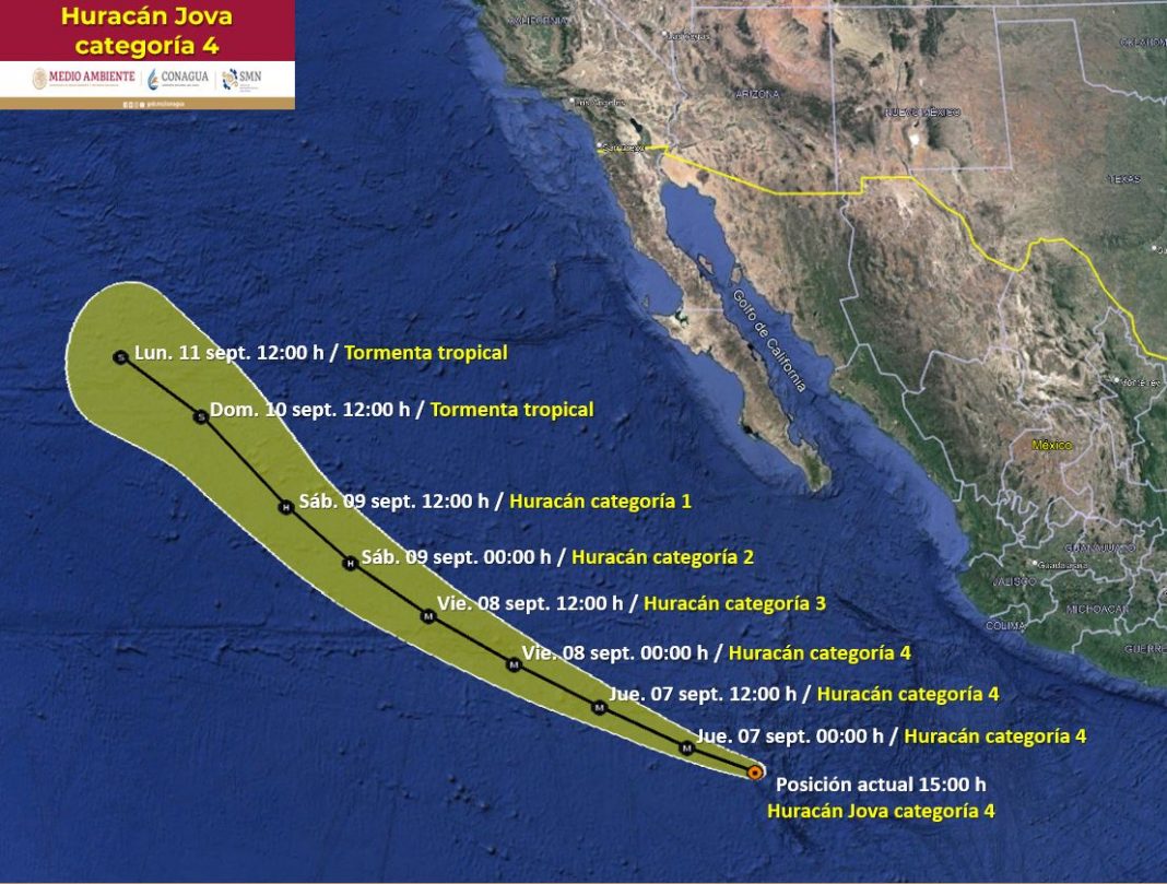 CIUDAD DE MÉXICO.- Jova se ha intensificado rápidamente a huracán de categoría 4 en la escala Saffir-Simpson, su circulación refuerza la probabilidad de lluvias muy fuertes a intensas, rachas de viento y oleaje elevado en Jalisco, Colima y Michoacán.