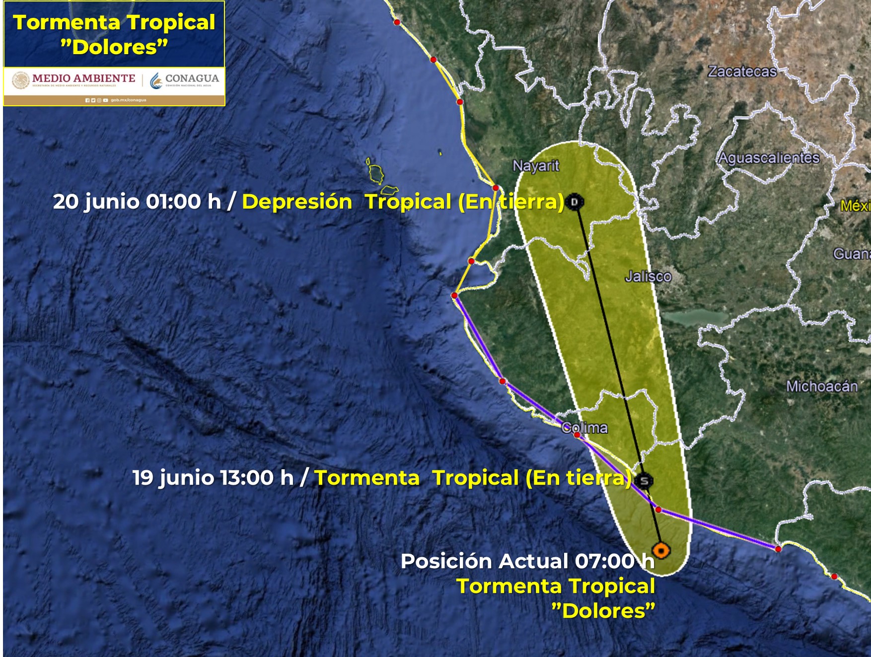 CIUDAD DE MÉXICO.- El centro de la tormenta tropical “Dolores” se se localiza al sur de las costas de Michoacán. Ocasiona lluvias de fuertes a extraordinarias, vientos fuertes y oleaje elevado en estados del occidente y sur del país.