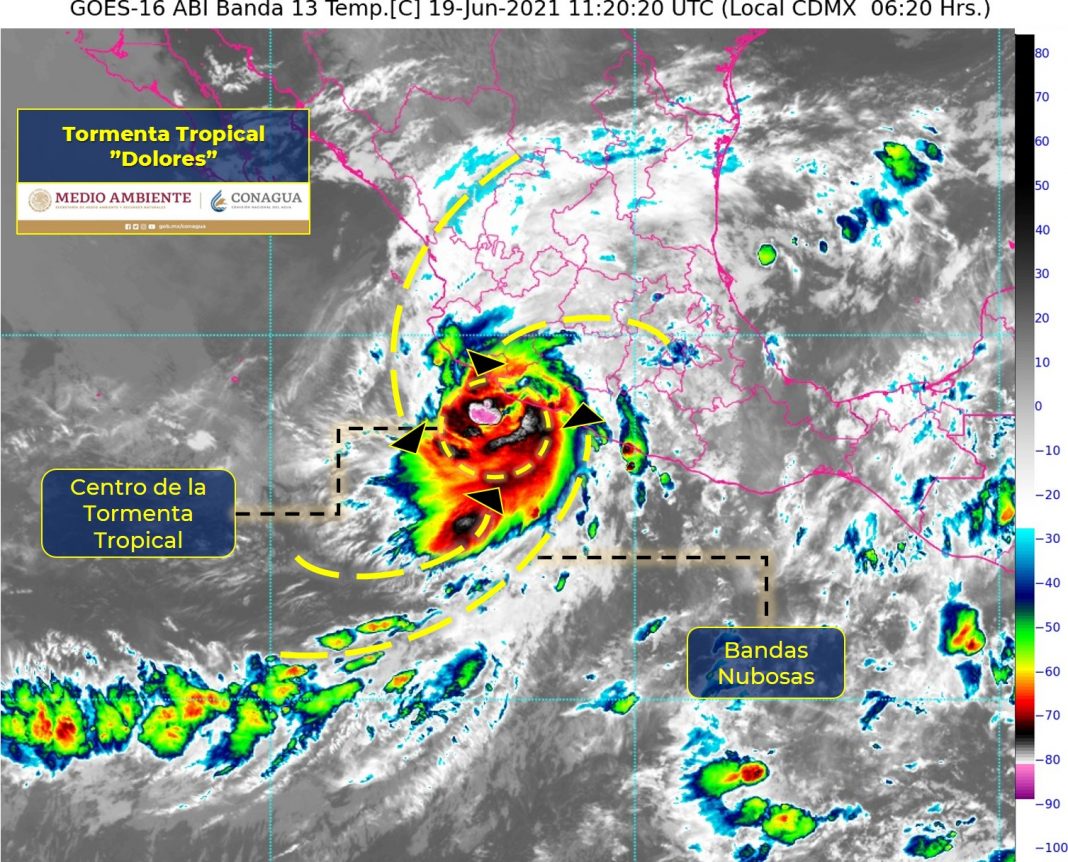CIUDAD DE MÉXICO.- El centro de la tormenta tropical “Dolores” se se localiza al sur de las costas de Michoacán. Ocasiona lluvias de fuertes a extraordinarias, vientos fuertes y oleaje elevado en estados del occidente y sur del país.