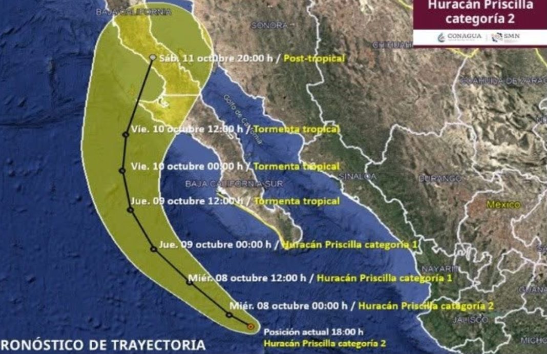 CULIACÁN, Sin.- El huracán Priscilla mantiene vientos máximos de 175 km/h con rachas de 215 km/h. Su centro se ubica a 320 km al sur-suroeste de Cabo San Lucas, BCS., se prevé que comience a debilitarse a partir del día de mañana.