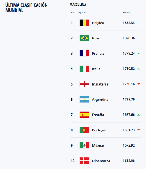 España sube a la séptima posición, Portugal baja a la octava; Alemania sube al lugar 12 y supera a Estados Unidos (en el 13) y Uruguay, que baja tres peldaños (cae al 15) y protagoniza la mayor caída entre las mejores 20 selecciones.