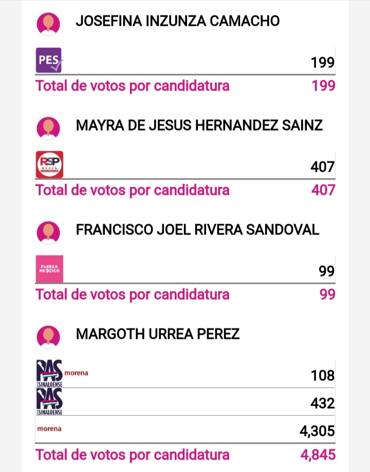 Con el 28.1% de las actas capturadas y de 14,785 votos contabilizados obtiene 4,845 lo que se traduce en el 32.2% del total de la votación, refleja el PREP