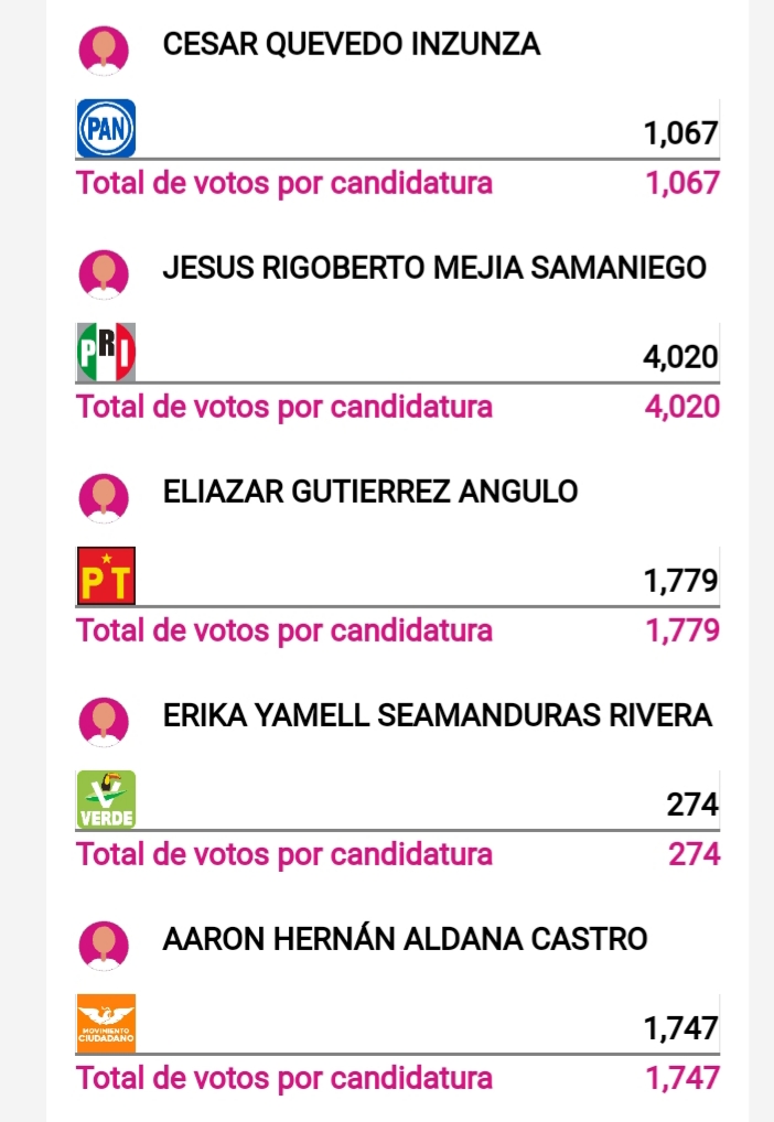 Con el 28.1% de las actas capturadas y de 14,785 votos contabilizados obtiene 4,845 lo que se traduce en el 32.2% del total de la votación, refleja el PREP