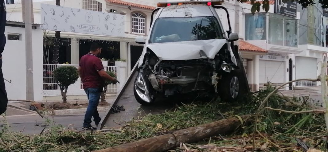 El vehículo circulaba de poniente a oriente y al llegar a una curva, a metros antes del bulevar Eldorado la conductora perdió el control, salió de su carril y terminó en el camellón llevándose un poste y una palmera.