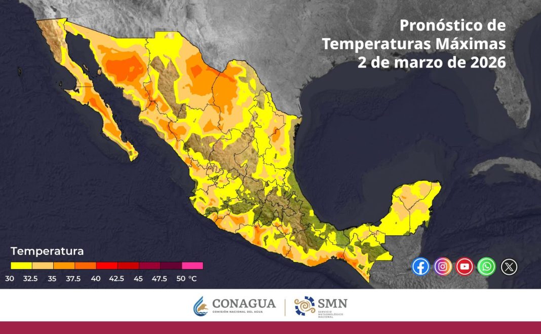 ☀️De 35 a 40 ºC en zonas de #BajaCalifornia, #BCS, #Chihuahua, #Durango, #Coahuila, #NuevoLeón, #Tamaulipas, #Zacatecas, #Nayarit, #Jalisco, #Colima, #Michoacán, #Morelos, #Puebla (suroeste), #Campeche y #Yucatán