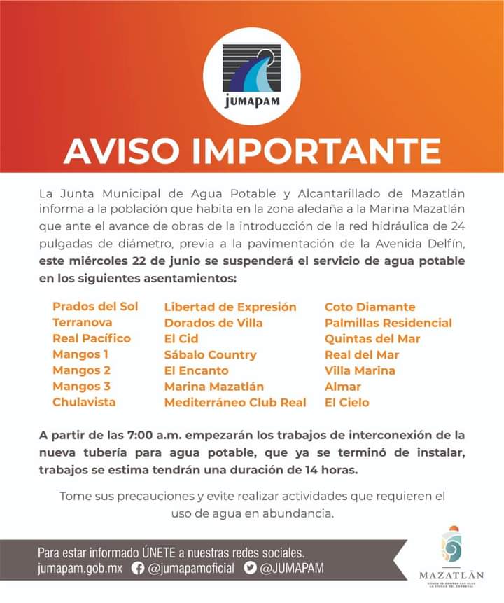MAZATLÁN, Sin.- La Junta de Agua Potable y Alcantarillado de Mazatlán informó de un corte al suministro por interconexión a los usuarios ubicados en el área de Chulavista hasta Cerritos, 21 sectores.