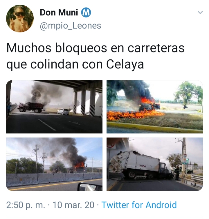 Usuarios de las redes sociales han compartido fotografías y videos donde se logra apreciar vehículos en llamas y llantas obstruyendo la carretera San Miguel de Allende, a la altura de la zona conocida como ‘Del Puente’, en la carretera Villagrán-Juventino Rosas, cerca del entronque al parque acuático ‘Villa Gasca’, en la Salamanca-Querétaro, así como en la Celaya-Querétaro, dichos bloqueos han iniciado alrededor de las 14:00 horas de este martes.