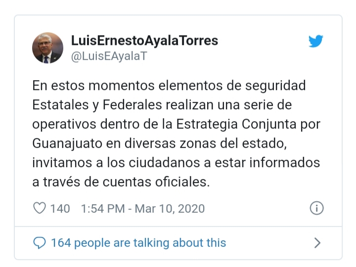 Luis Ernesto Ayala Torres, Secretario de Gobierno, informó a través de su cuenta de Twitter que elementos de seguridad Estatales y Federales acudieron a las zonas para realizar una serie de operativos, además recomendó a la población utilizar vías alternas.