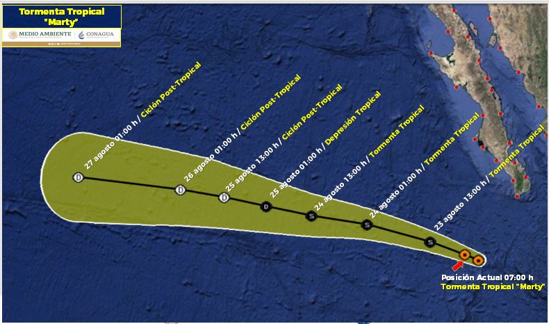 CIUDAD DE MÉXICO.- La tormenta tropical “Marty” se localiza al sur-suroeste de Cabo San Lucas, B.C.S. con desplazamiento hacia el oeste.