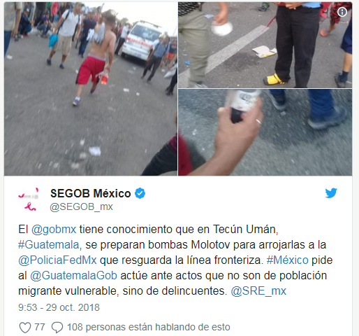 La Segob reportó a través de redes sociales que cuenta con conocimiento que en Tecún Umán, Guatemala, migrantes preparaban bombas Molotov para arrojarlas contra policías federales, por lo que pidió al gobierno guatemalteco actuar “ante actos que no son de población migrante vulnerable, sino de delincuentes”.