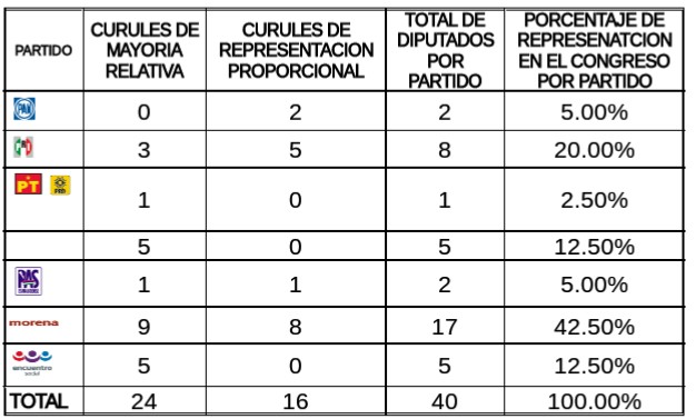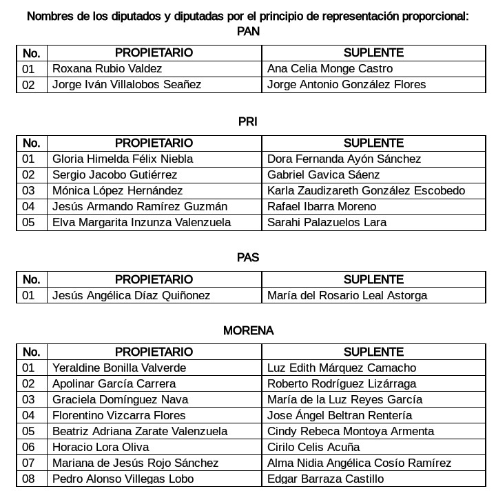 De acuerdo a los porcentajes de votación se asignaron un total de 16 diputaciones por el principio de representación proporcional, de acuerdo con cada una de las etapas estipuladas en la fórmula de referencia, quedando distribuidas en número y en partidos de la siguiente manera: Partido Acción Nacional (PAN), 2; Partido Revolucionario Institucional (PRI) ,5; Partido Sinaloense (PAS), 1 y Movimiento de Regeneración y MORENA, 8.