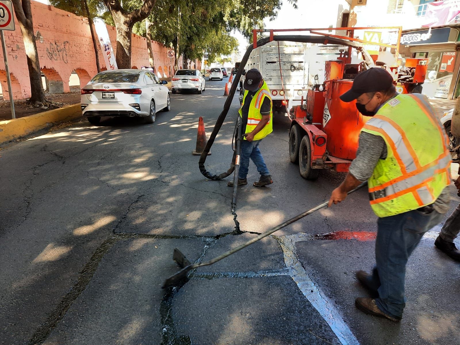 Se llevan a cabo trabajos de calafateo o sellado de grietas en la avenida Xicoténcatl sector Las Quintas