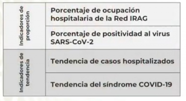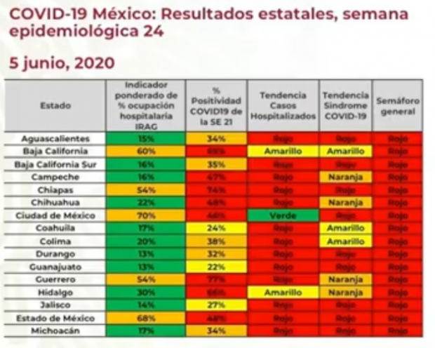 Otro ejemplo es el de Zacatecas, que tiene un indicador de cada uno de los colores, lo que quiere decir que tiene buena suficiencia en sus hospitales, pues tiene positividad en amarillo, pero la tendencia de casos va creciendo. “Por eso está en rojo. Por principio de seguridad así se deja”.
