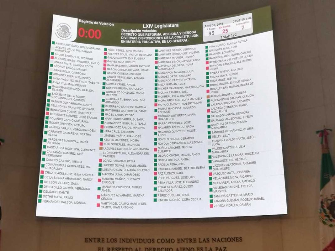 CIUDAD DE MÉXICO.- Con 95 votos a favor de Morena, PT, PVEM, PES, PRD, Movimiento Ciudadano y PRI; 25 en contra del PAN y 2 abstenciones, el pleno de la Cámara de Senadores aprobó la nueva Reforma Educativa, con lo cual queda derogada la anterior reforma, instrumentada durante el sexenio pasado.
