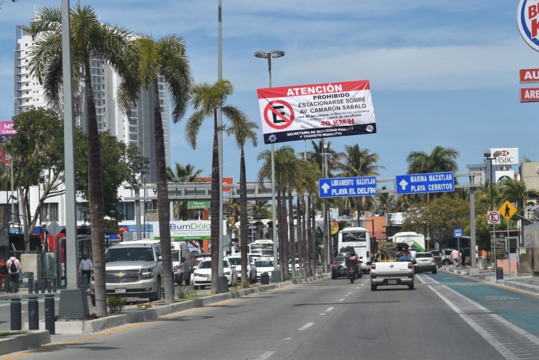 MAZATLÁN, Sin.- Elementos de Tránsito Municipal, colocaron mantas informativas y restrictivas, por la avenida Camarón-Sábalo, desde Paseo Claussen hasta Cerritos.