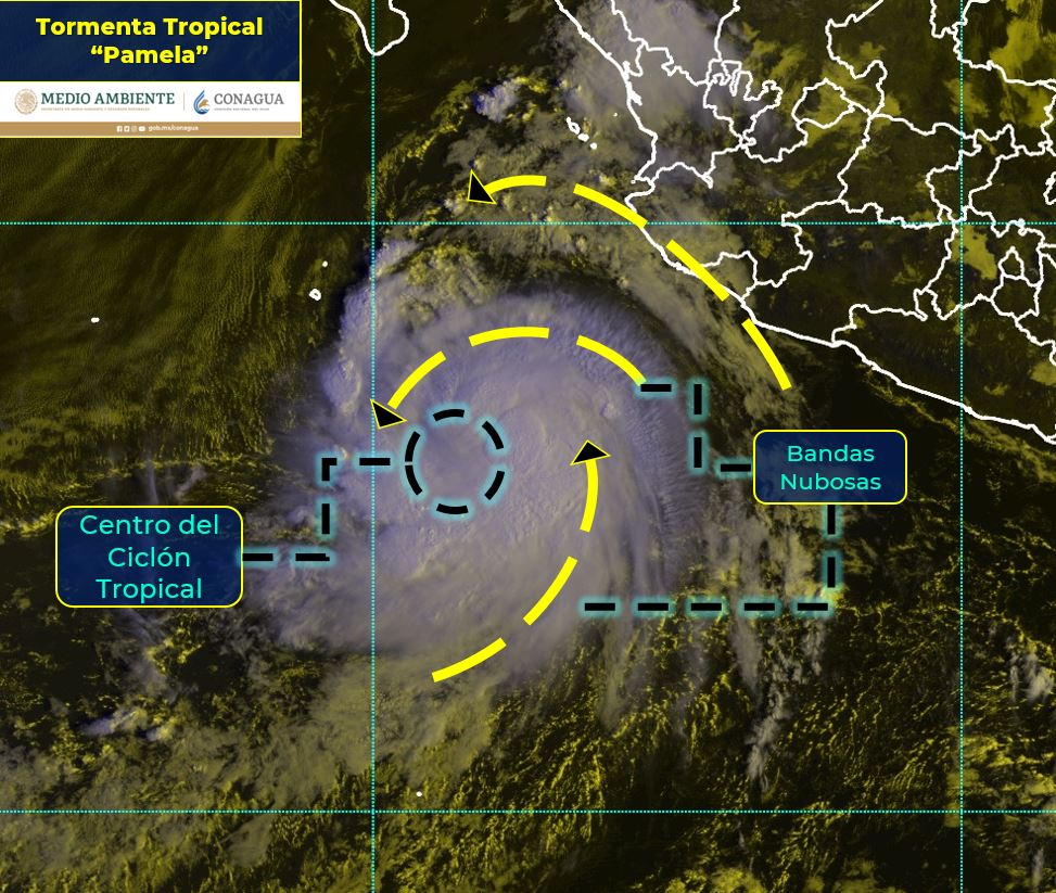 CIUDAD DE MÉXICO.- Las bandas nubosas de la tormenta tropical “Pamela” ocasionarán durante este lunes, lluvias fuertes a puntuales muy fuertes, rachas fuertes de viento y oleaje elevado en estados del occidente de México.