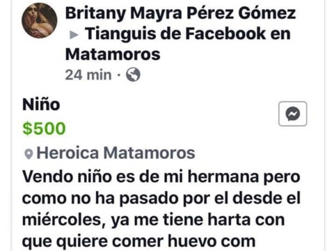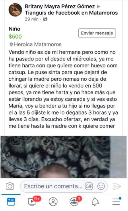 Vendo niño es de mi hermana, pero como no ha pasado por él desde el miércoles, ya m tiene harta con que quiere comer huevo con cátsup. Le puse cinta para que dejara de chingar la madre, pero nomás no deja de llorar; si quiere el niño lo vendo en 500 pesos; ya me tiene harta y no hace más que estar llorando, ya estoy cansada. Y si ves esto María, voy a vender a tu hijo si no llegas por él a las 5, dijiste que lo dejabas 3 horas y ya llevas 3 días. Escucho ofertas, en verdad ya me tiene hasta la madre con que quiere comer”, se detalla en el anuncio.